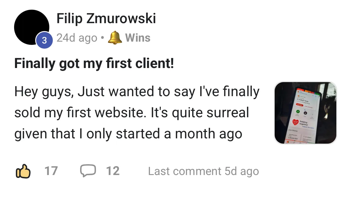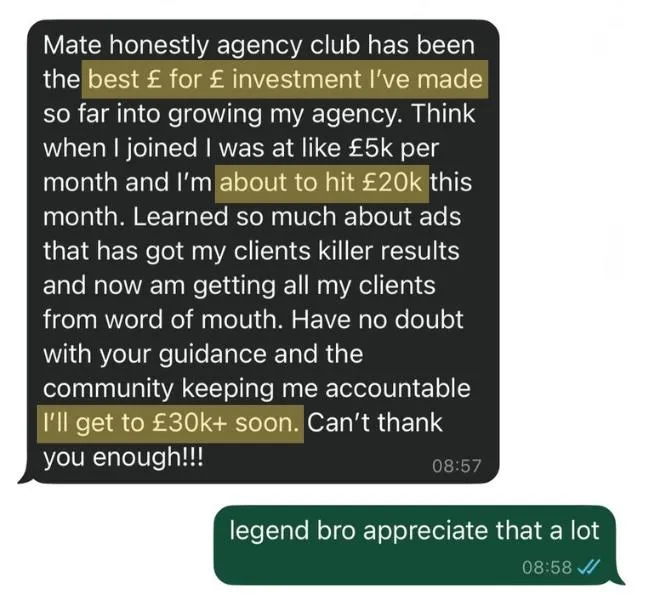 "Think when I joined I was at about £5k per month, I'm about to hit £20k this month. Learned so much about ads that has got my clients killer results and I'm now getting all my clients from word of mouth!"