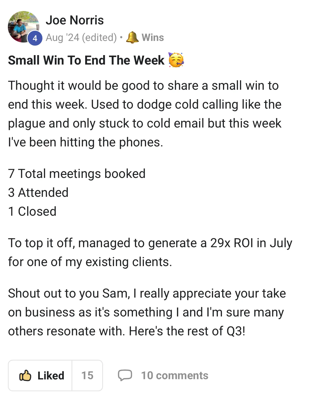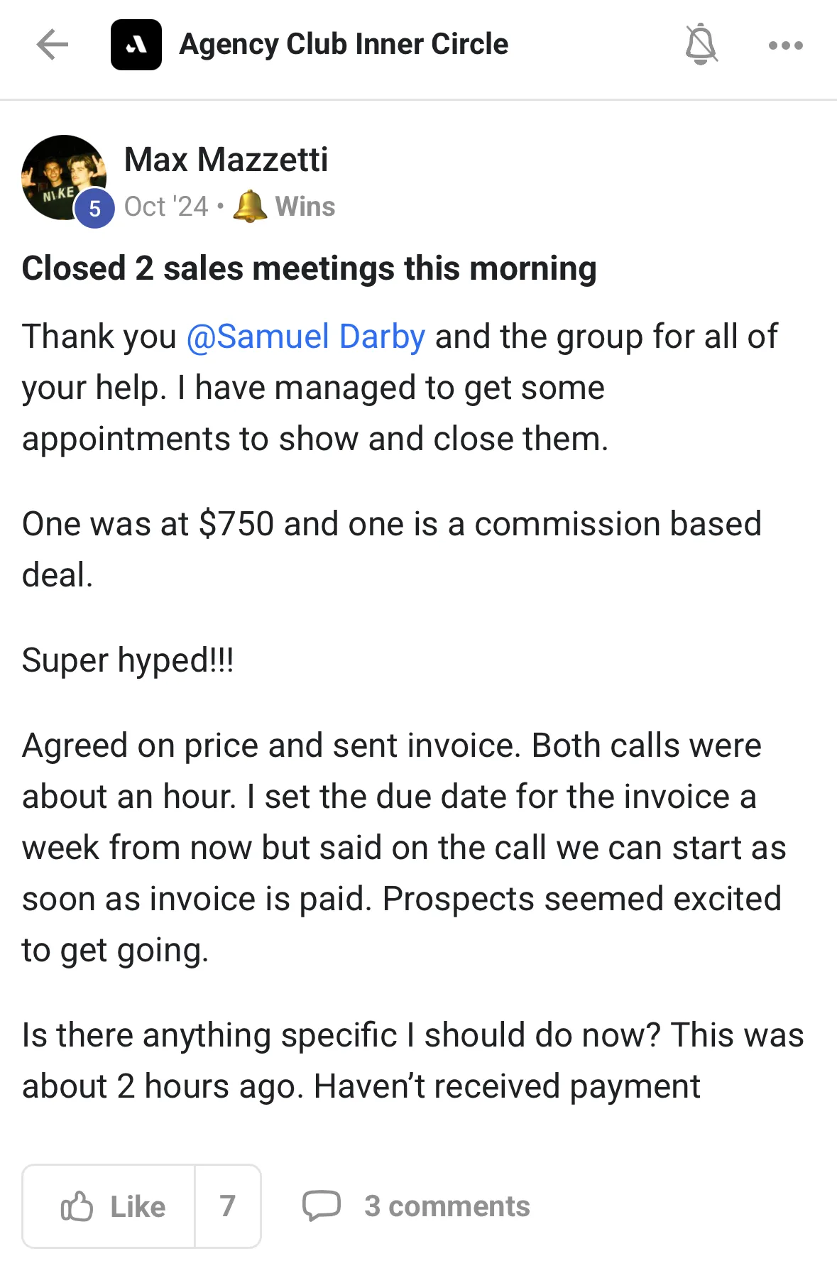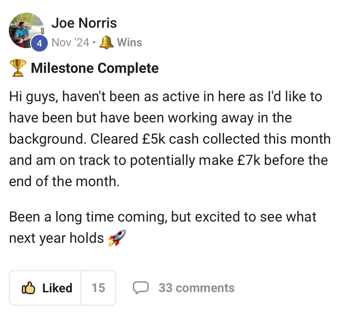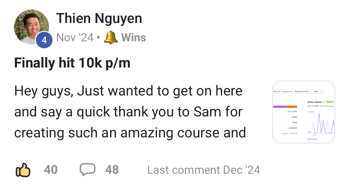 "I realised the other day I joined at about £500-750 MRR and I'm likely to breach £6k MRR this month so I've basically 10X the biz using this community and your coaching..."